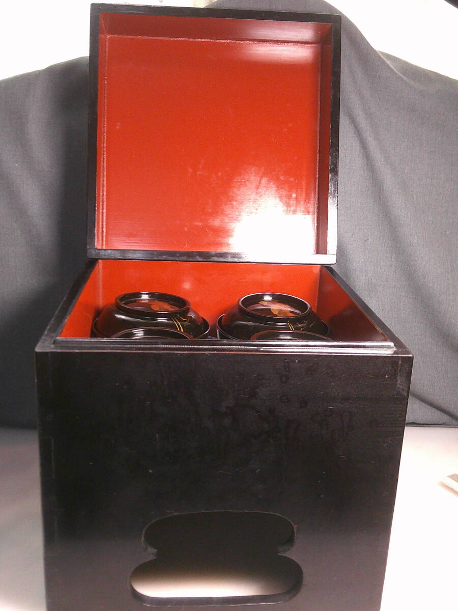 - ◆木製漆器 漆塗り 舟曳き蒔絵・4客&一人膳・椀サイズ直径13㌢高8㌢◆880