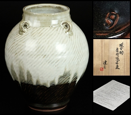 - 【 島岡達三 】秀逸作 掛合釉象嵌縄文壷 人間国宝 共箱 保証
