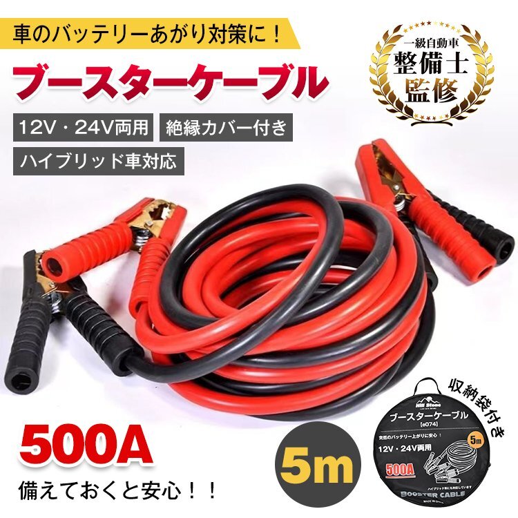 - 1円 車 ブースターケーブル 5m 12v 24v 対応 大型車 500a 絶縁カバー 収納袋 バッテリーあがり 救護 緊急 対策 カー用品 e074