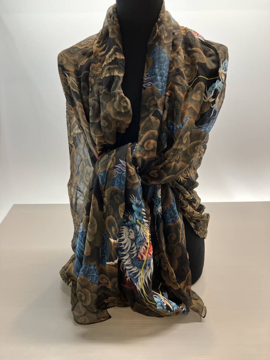 > ★ YOHJI YAMAMOTO ヨウジヤマモト FM-L03-500 シルクストール マフラー ドラゴン 日本製 ブラウン × ブルー 通年