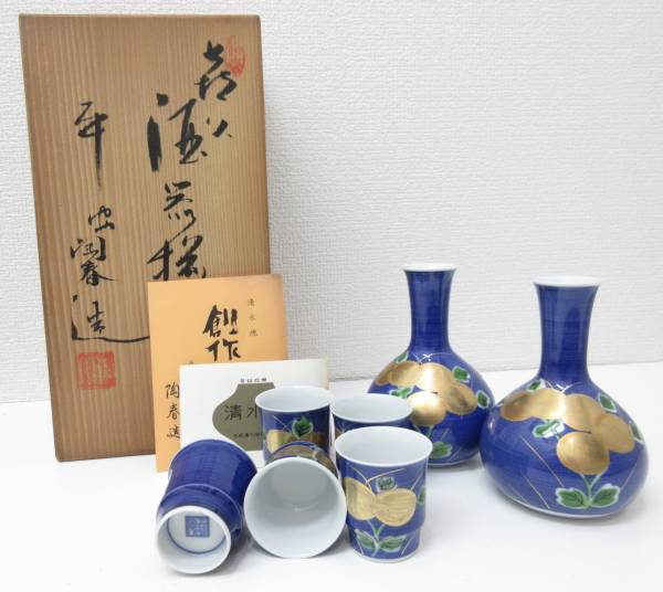 - 未使用■京焼 清水焼 創作陶芸 酒器揃 徳利 お猪口 ぐい呑 陶春 管理1701 E-1