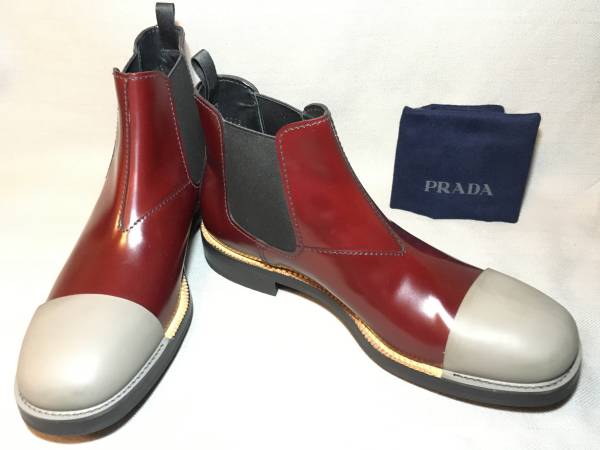 - 新品 プラダ コレクション サイドゴア レザー ブーツ 10 PRADA 革靴 ボルドー グレー シューズ