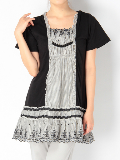- 314◇刺繍入り縦ブロッキングチュニ 黒 ブラック axes femme アクシーズ ファム PS352X09 チュニック