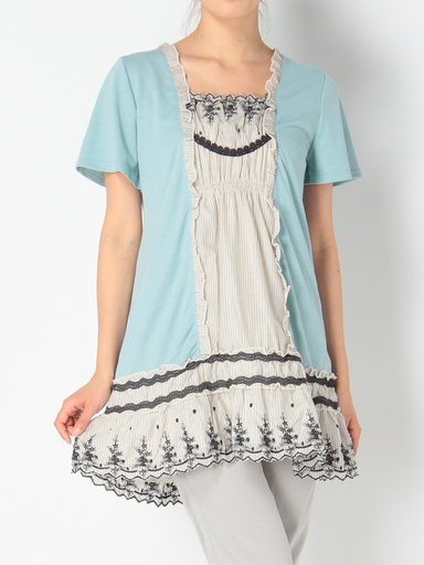 - 308◇刺繍入り縦ブロッキングチュニ サックス axes femme アクシーズ ファム PS352X09 チュニック