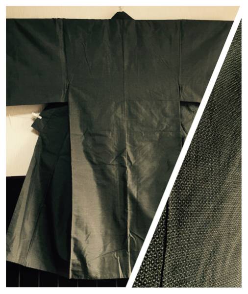 - 【男性着物】正絹 袷 着丈140.5cm 亀甲の地模様 海松色(暗い黄緑色) 普段着