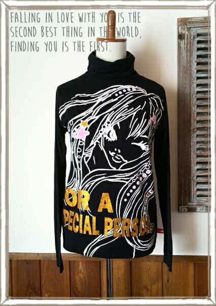 - n. 女の子 顔 絵柄 ハイネック カットソー 長袖 Mサイズ ブラック黒 レディース トップス S