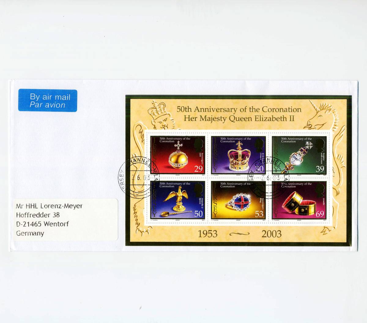 - 英領 ジャージー JERSEY 2003年◆クイーン 即位50周年 初日特印 エンタイア 封書 1枚 送料無料 ◆p-298