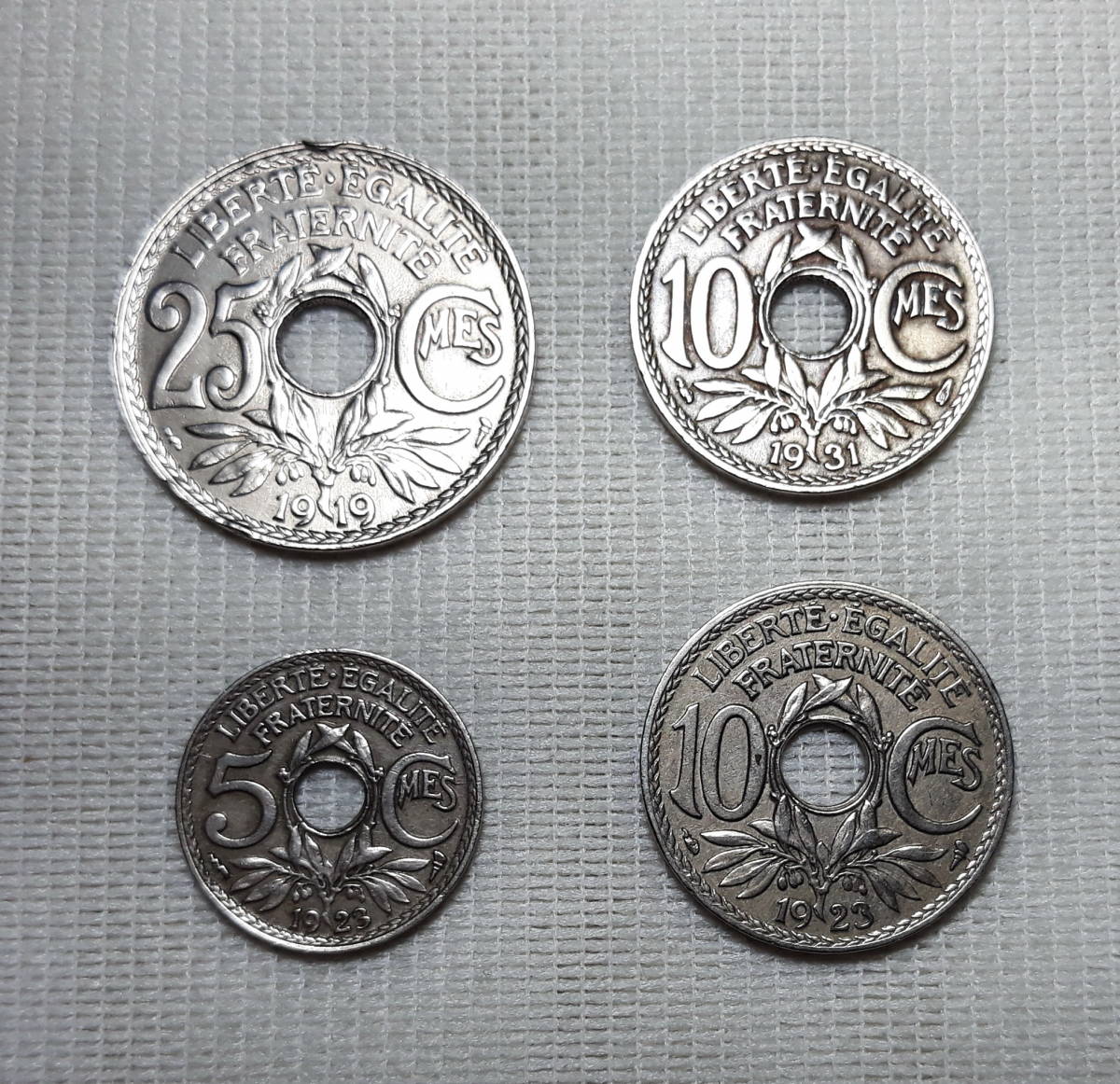- 1919~ フランス 古い硬貨 4枚 有孔 ◆o-34