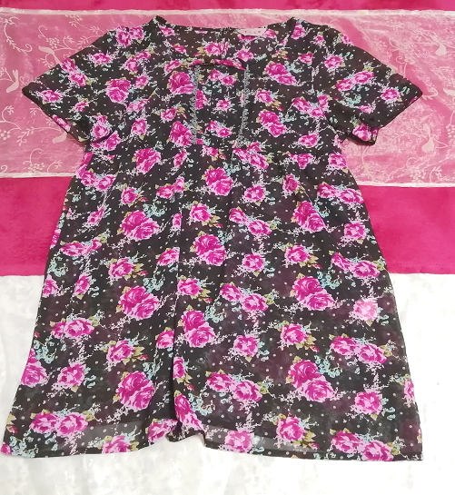 > ピンクと黒バラ花柄ネグリジェチュニックワンピース Pink and black rose flower pattern negligee tunic dress