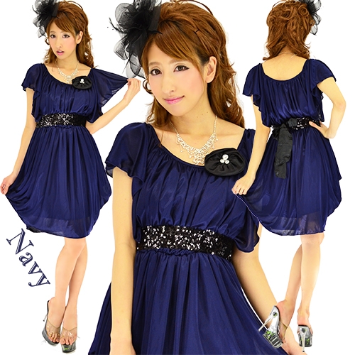- フリーサイズ コクーンドレス ベルト・コサージュ付き(紺)