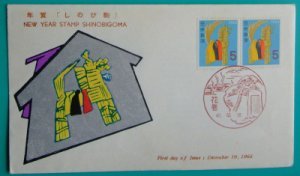 > 初日印◆FDC◆年賀2枚組 昭和41年用「しのび駒」2枚 1965.12.10.発行 + 昭和43年用「のぼりざる」 1967.12.11.発行