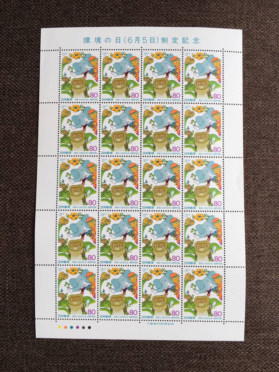 > ★未使用 環境の日 6月5日 制定記念 村上勉 イラスト 生き物の環 象 蛙 猿 猫 鳥 オウム 蝶 1994年 平成6年 80円 20枚 切手シート 日本郵便