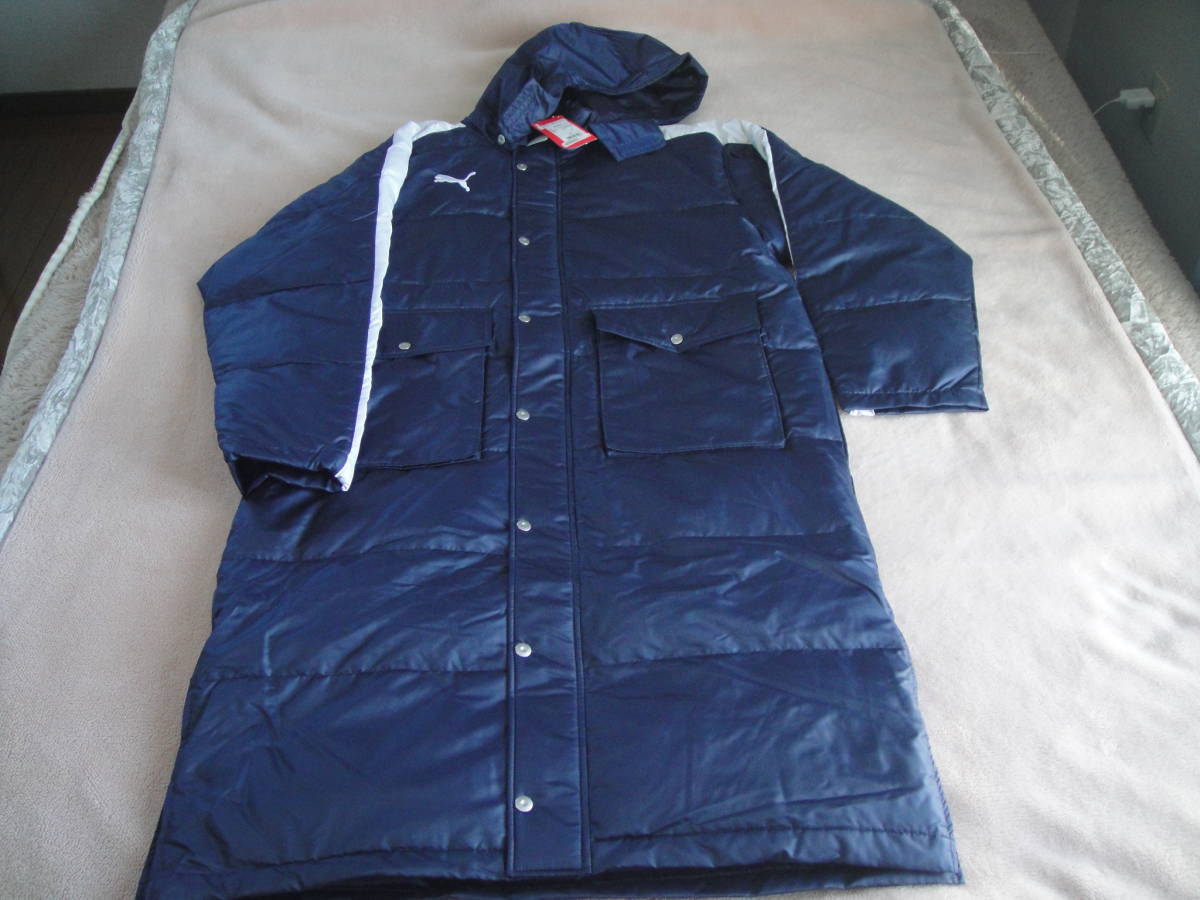 - PUMA・プーマ ベンチコート ロングダウンコート(ダウン 90%・フェザー 10%)収納袋付き XO 紺 脱着フード 2重袖 862251-01