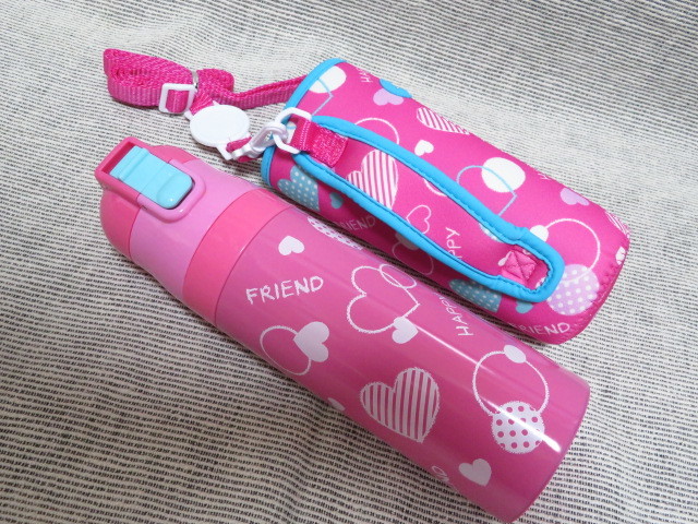 - 値下!スケーター ハート水玉スウェット生地カバー付きダイレクトステンボトル480 持ち手ショルダーストラップ付 お子様にも!