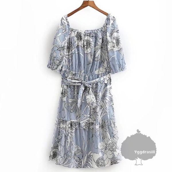 > YGG★新品 オフショルダー 膝丈 ワンピース 花柄 ストライプ 水色 S フラワー柄 ストライプ 膝丈 ミディ レディース
