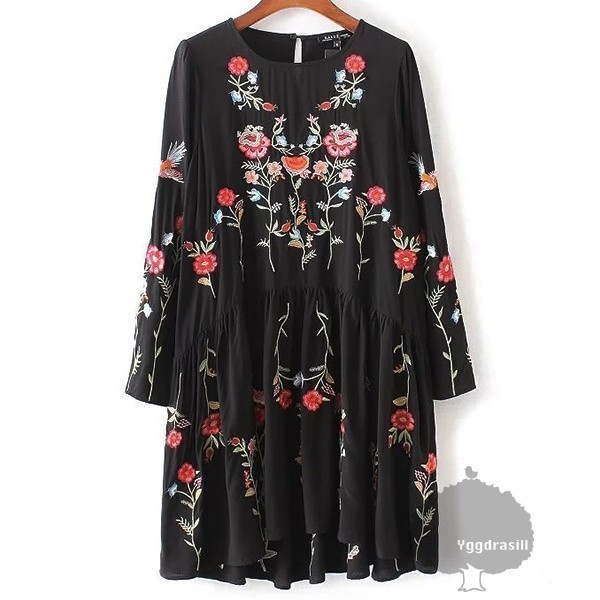 > YGG★新品 フレアチュニック ワンピース 黒 刺繍 花柄 S シフォン フレア ミニ エンブロダイリー フラワー ブラック