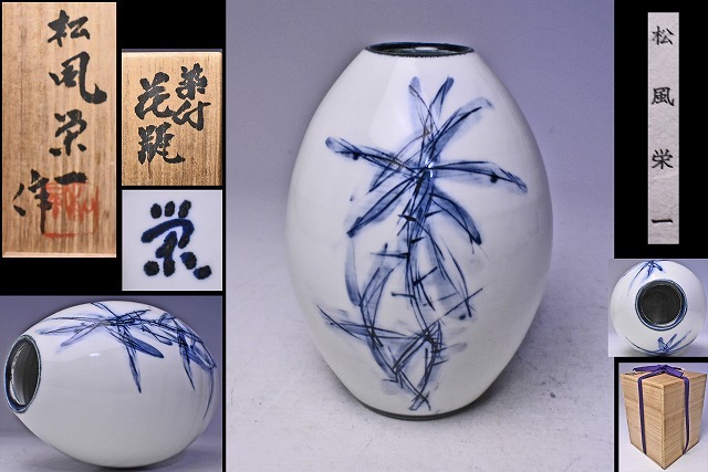 - 松風栄一 ★ 染付花瓶 ★ 共箱栞 ★ 独特の意匠が美しい逸品 ★ 華道具 ★