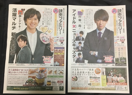 - 読売ファミリー★2017.3/15号『news everry』NewS 小山慶一郎 2017.2/8号 『嫌われる勇気』 加藤シゲアキ きらめきインタビュー 近畿限定