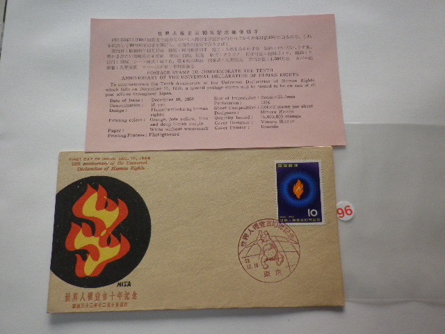 - FDC 世界人権宣言10年 1958年 東京特印 解説書有●96●