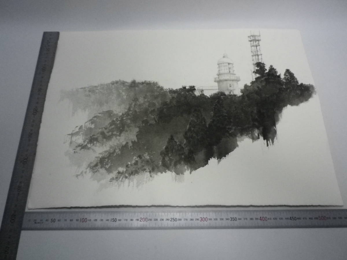 - 「岬の灯台2」水墨画【坂垣内 将泰】作者直筆原画「真作」P10号ハーネミューレ紙(経年保管品)【送料無料】00700002
