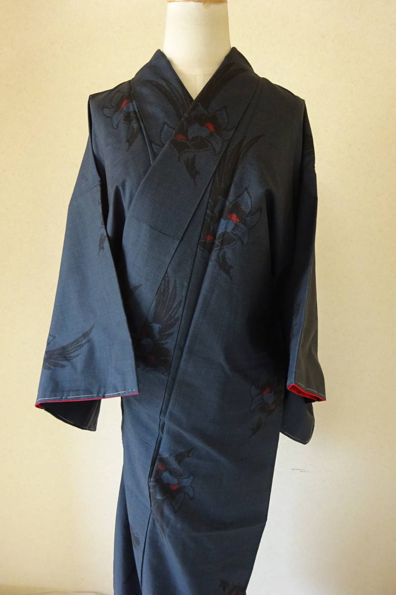 - (26)未使用 しつけ付 着物 大島紬 袷 ネイビー 花模様 和装 和服