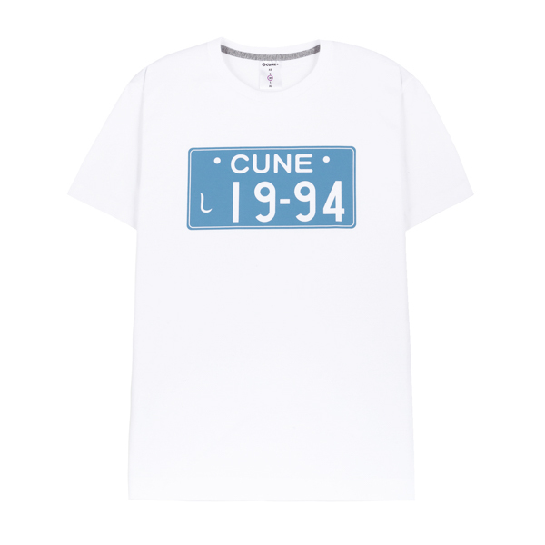 > CUNE キューン Tシャツ 半袖 白 『ナンバープレートTシャツ』 前後プリント L・身幅約54cm※未試着品/未使用品/商品タグ付き/2019年製品
