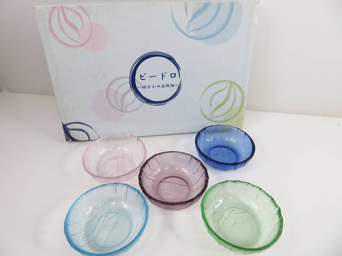 - ▲ビードロ 硝子小皿 ガラス 小皿 5枚セット 色違い 箱あり 未使用品 管理2004 R-10
