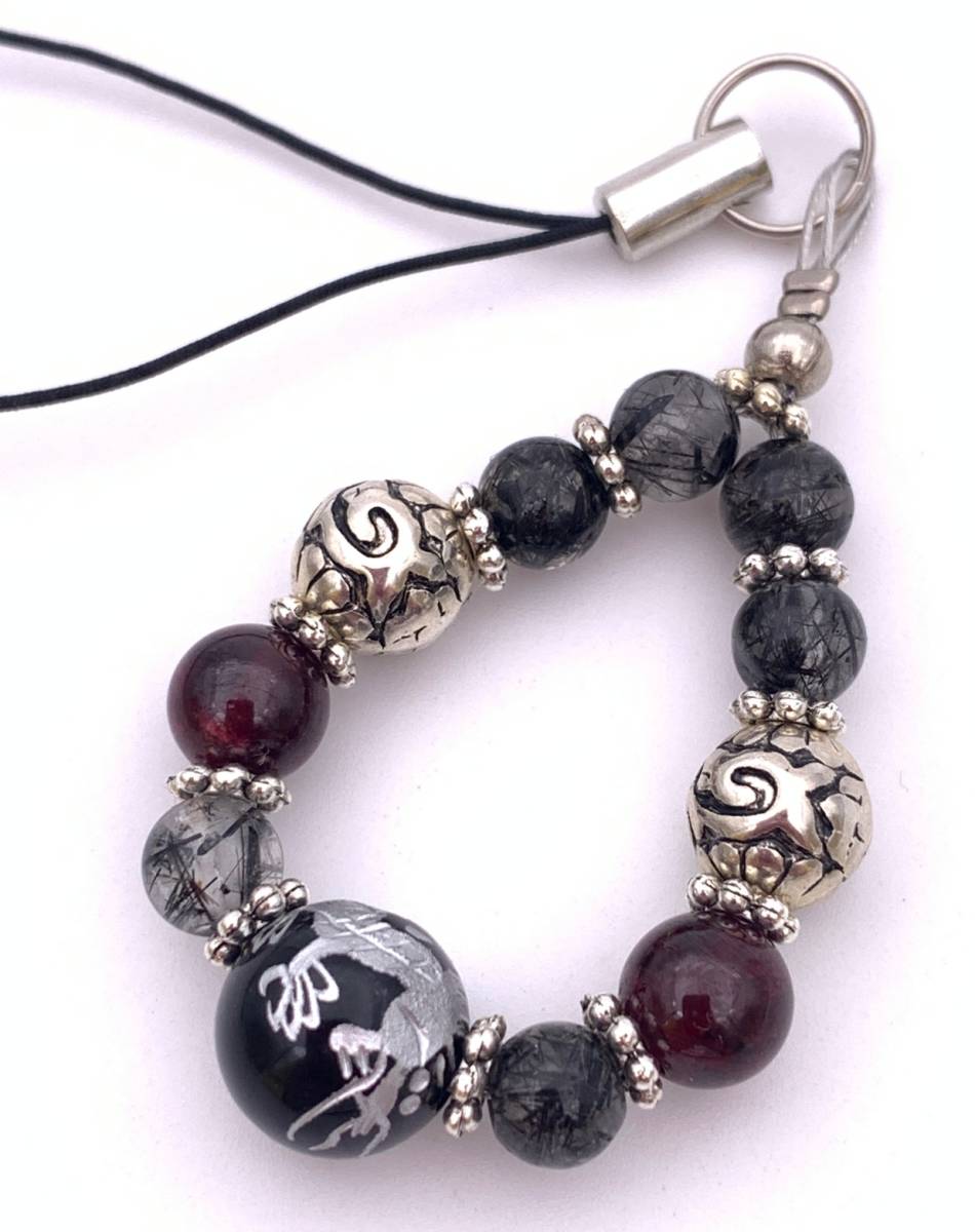 - 天然石オニキス銀彫り青龍&ブラックルチルクォーツ&ガーネットのストラップ