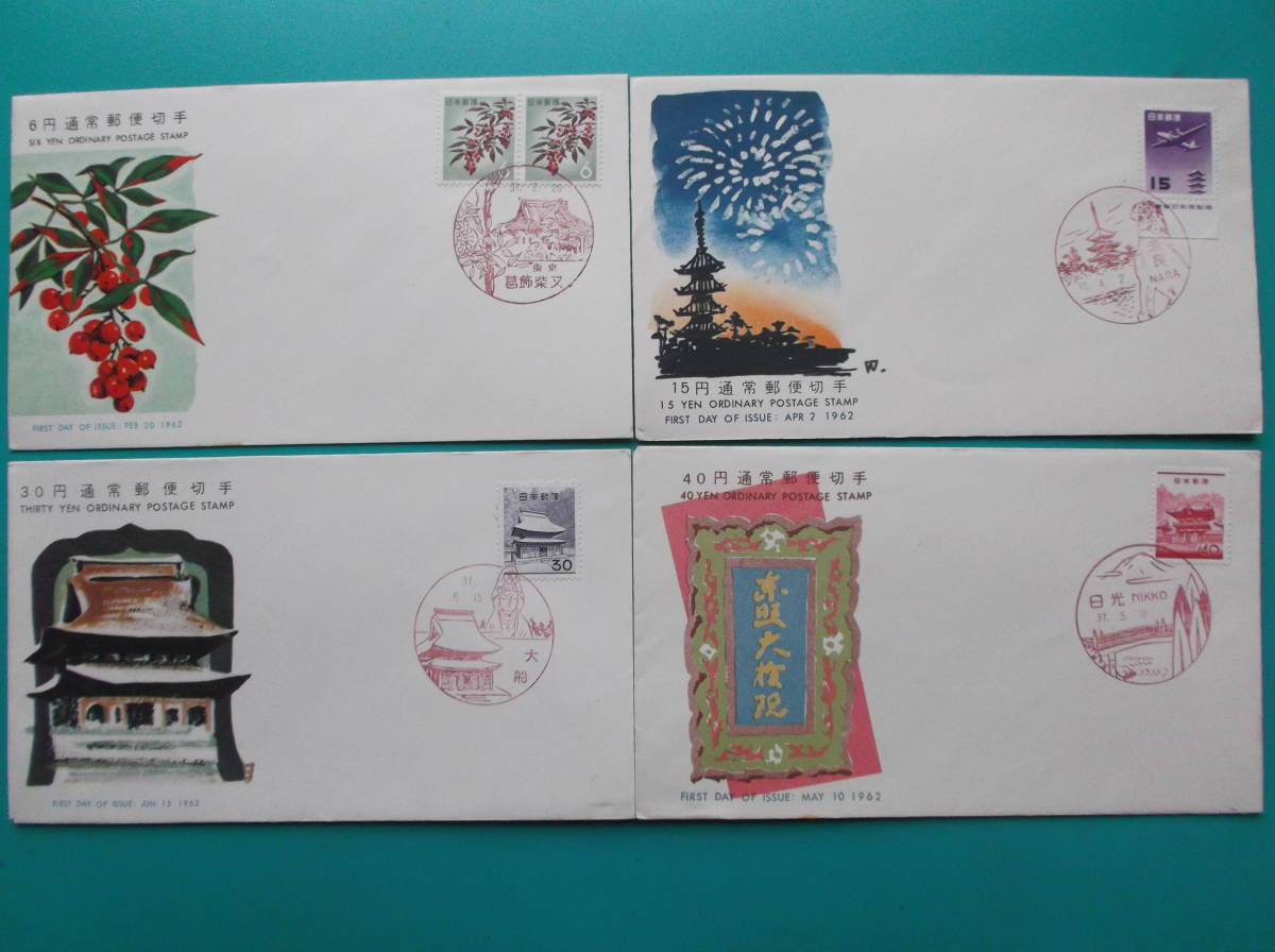 > 初日印◆FDC◆昭和37年(1962年)発行 通常切手 4枚組 6円なんてん 15円五重塔(銘版) 30円円覚寺舎利殿 40円日光陽明門