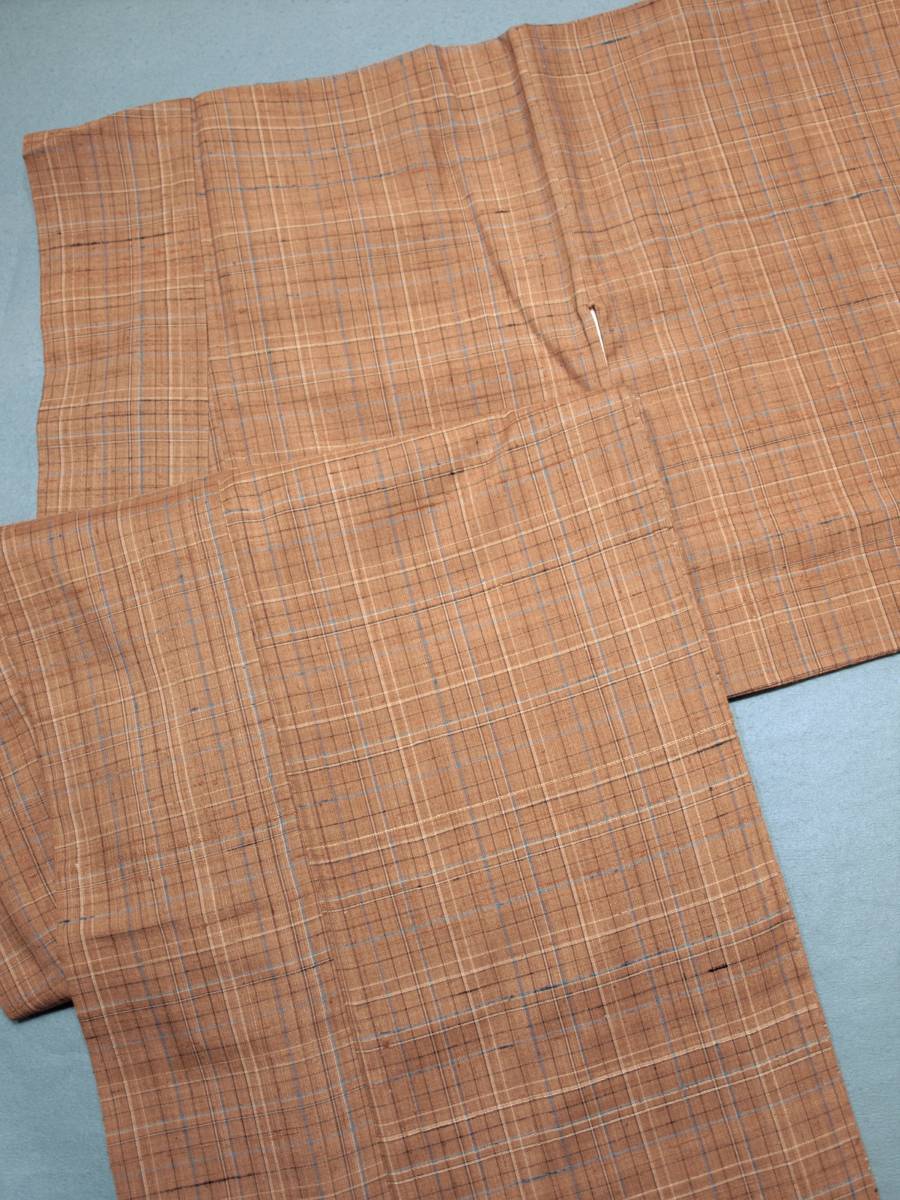 - 花とら★★さらに値下げしました★★ ●リサイクル着物 紬 格子 民芸調 普段着 薄茶 カジュアル 200503