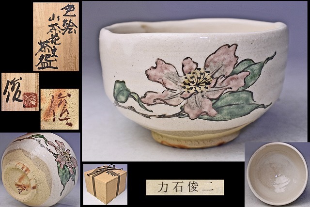 > 力石俊二 ★ 色絵山茶花文茶碗 ★ 共箱 栞 ★ 益子焼 ★ 氏らしい筆致に高台の緋襷も景色となった逸品 ★ 茶道具 ★