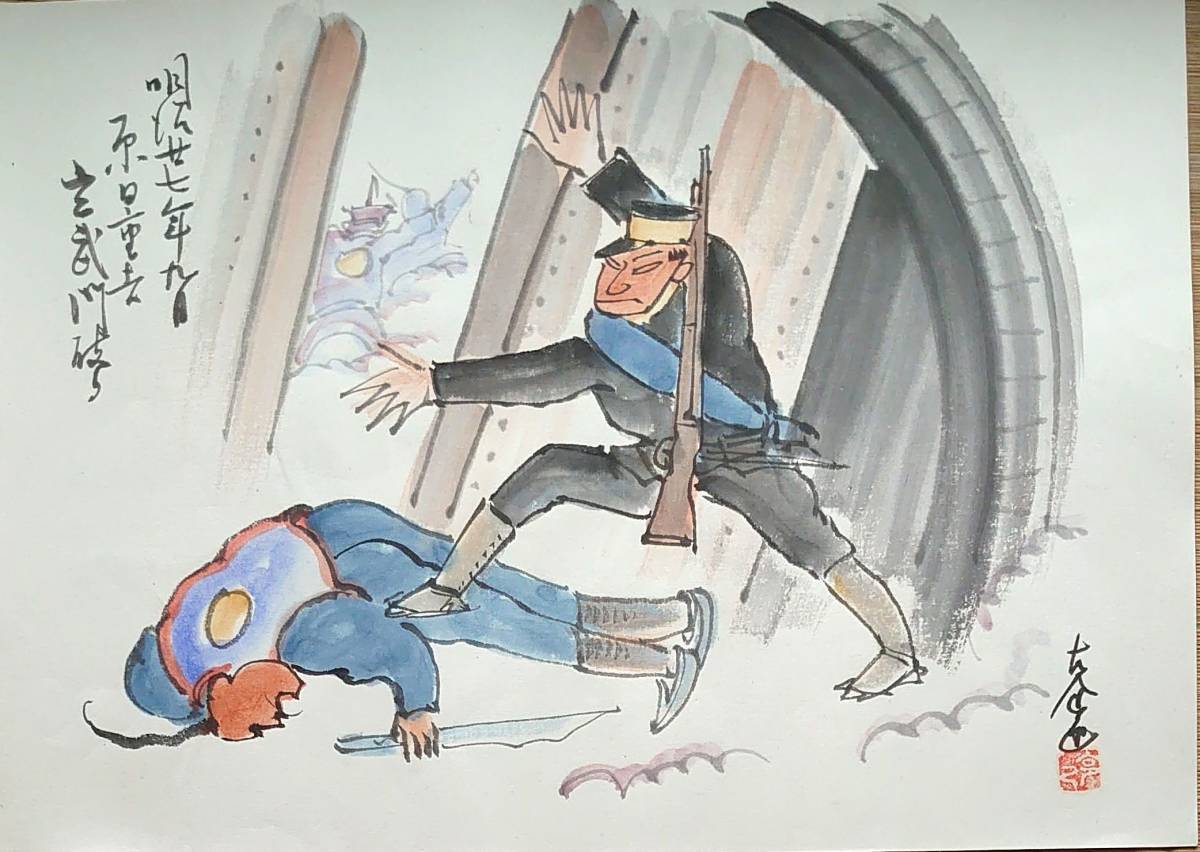 - f20071603〇肉筆漫画 色彩手書き 開国六十年史図絵 No.18 日清戦争 明治27年 小林克己 昭和2年 中央美術協会〇和本古書古文書