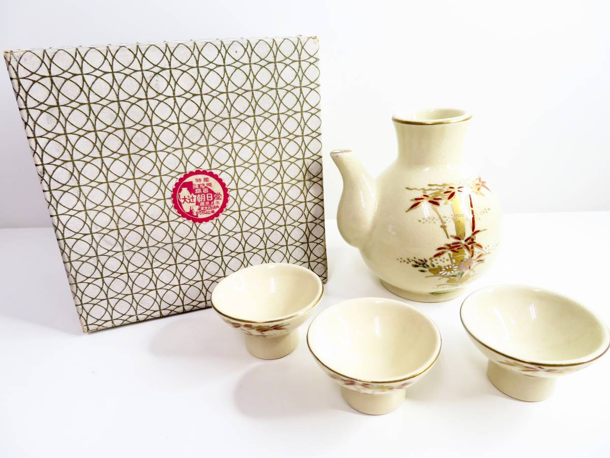 > 未使用品▲大辻朝日堂 薩摩焼 手作り手描きの味 酒器 徳利 お猪口3客 銘あり 箱あり 管理2007 U-7