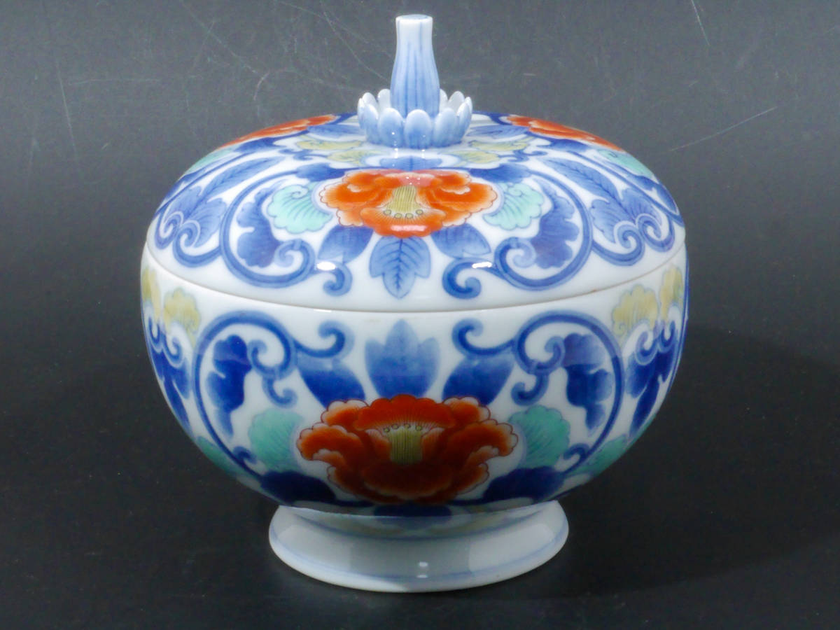 - 【値下げ交渉有り】 オールド 香蘭社 明治~大正期 染錦 椿 花唐草文 飾摘み 蓋物 菓子器