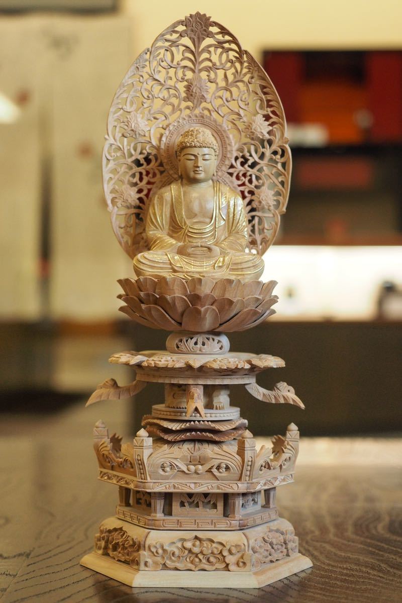 - 新品未使用 総白檀 座釈迦 2.5寸 上級彫 ケマン付六角台座 金泥書 木彫 仏像 仏教美術 釈迦如来