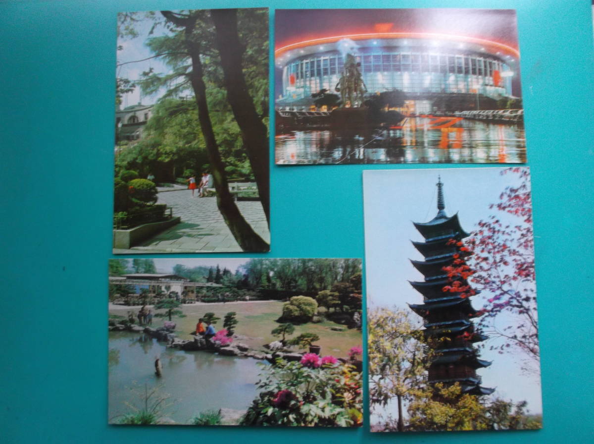 - 昔の絵葉書 11枚組袋付 中国大陸 上海 緑化地帯 体育館 盆景園 松江方塔 黄浦江夜明 蘇州河両岸夜景 上海市景 玉佛寺大雄宝殿 古猗園冬景色