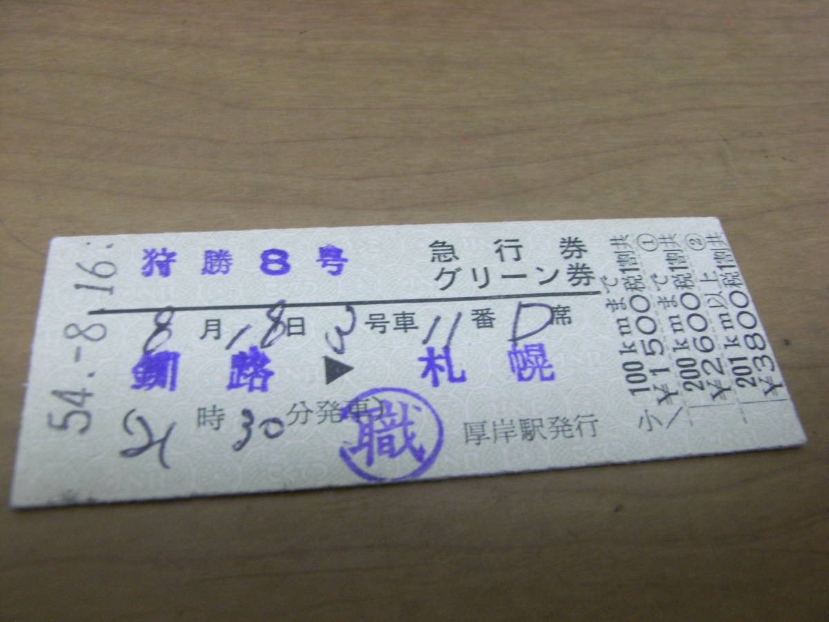 - 狩勝8号 急行券 グリーン券 釧路→札幌 昭和54年8月16日 厚岸駅発行