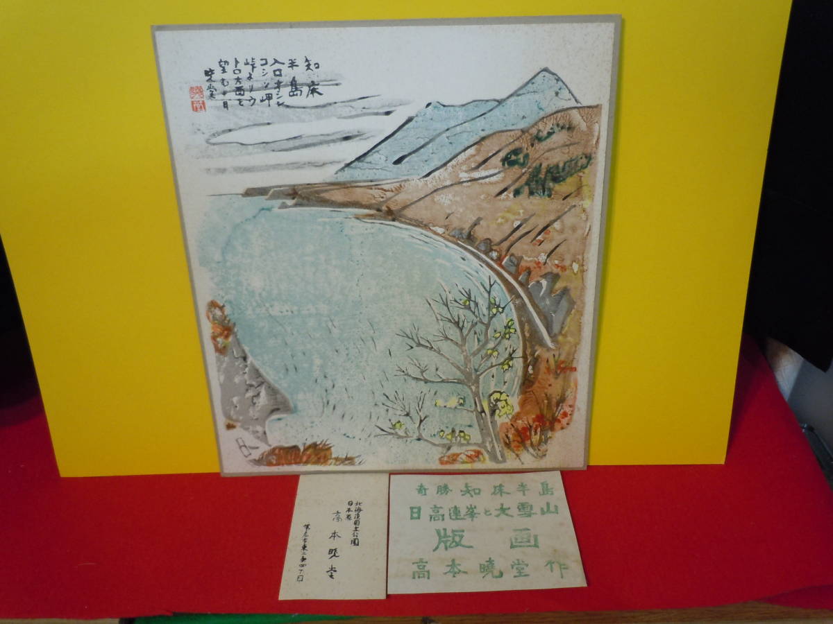 > 【ARS書店】版画【色紙】奇勝.知床半島『オシンコシン峠よりウトロ方面を望む』宇登呂海岸・日本画家:高本暁堂・落款有・名刺付・1970年頃