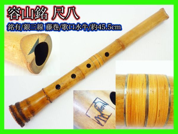 > 必見 容山 銘有 尺八 銀継 藤巻 銀三線巻 歌口水牛 刻印 在銘 約45.5cm 中継 竹製 内部漆 旧家蔵出 伝統狂言雅楽能和楽器 美品 マニア_S8