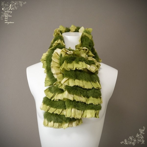> 値下☆訳あり特価!USED*Karen monny collection/フランス製シルク×ラビットファーフリルストール/グリーン/緑系/お洒落/上品/カジュアル