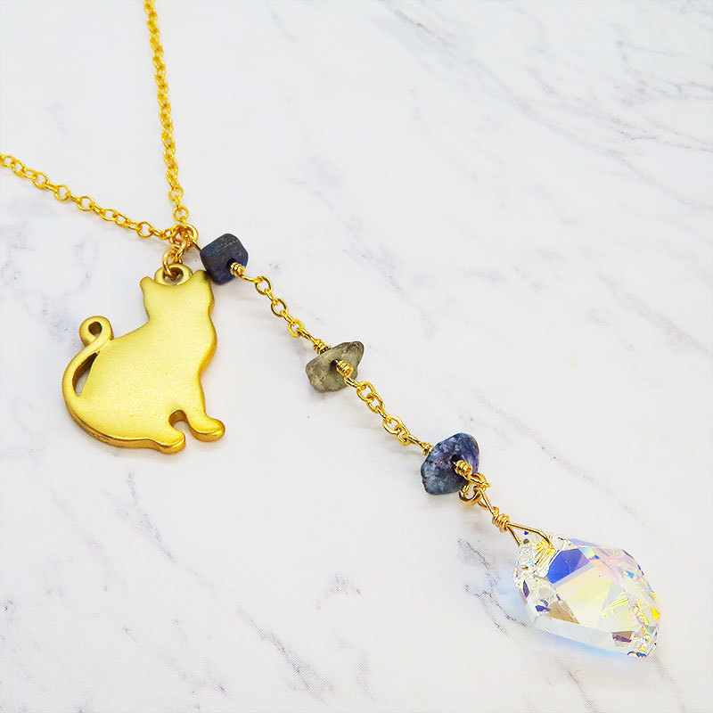 > 猫シルエットモチーフネックレス スワロフスキー・クリスタル(クリスタルオーロラ) ラピスラズリ 14KGF ゴールドフィルド