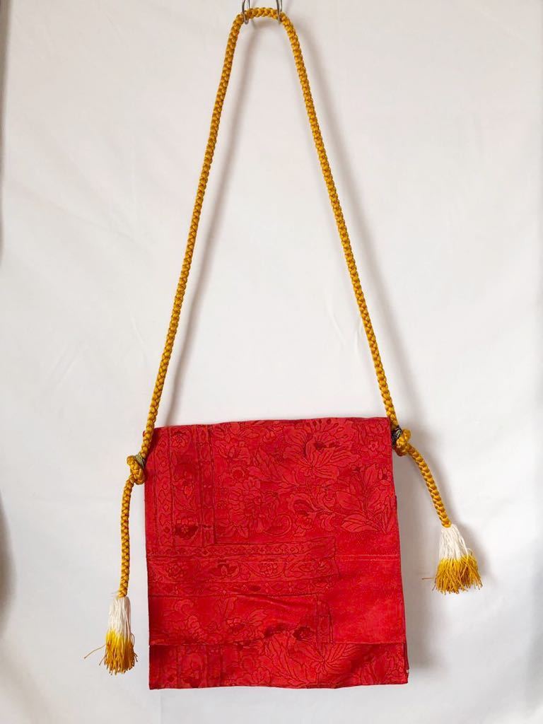 - 新品着物リメイク名古屋帯&帯紐利用2WAYポシェット斜めがけバッグ♪赤柄無地、黄色帯紐