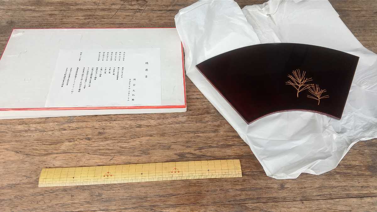 - 河合久仁雄 扇面溜塗若松蒔絵 菓子皿 紙箱 塗の仕上がりは見事です!