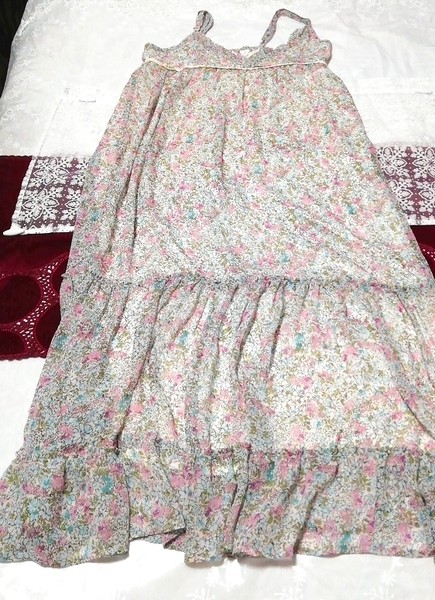 > 水色ピンク花柄シフォンネグリジェキャミソールマキシスワンピース Light blue pink floral chiffon negligee camisole maxi dress