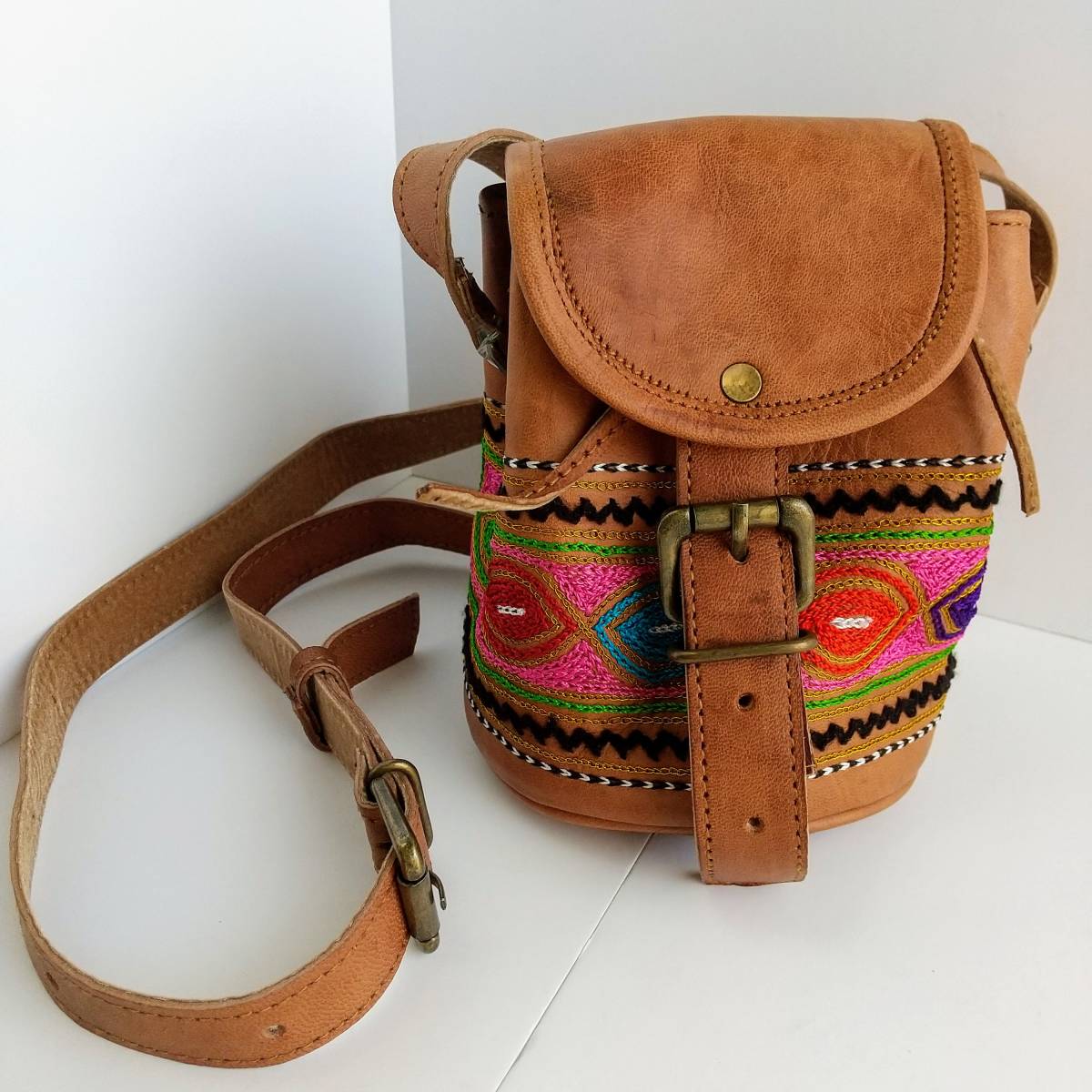 - 【未使用品】キャメルレザー刺繍 ミニショルダーバッグ/革製品/インド民芸品☆