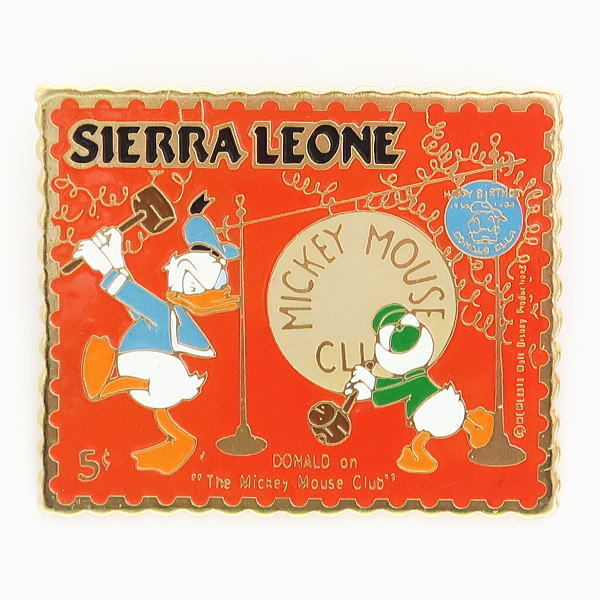 - ディズニー ドナルド&ルーイ スタンプ・ピン ドラを叩く 1990年代リリース Sierra Leone発行の切手がモチーフ