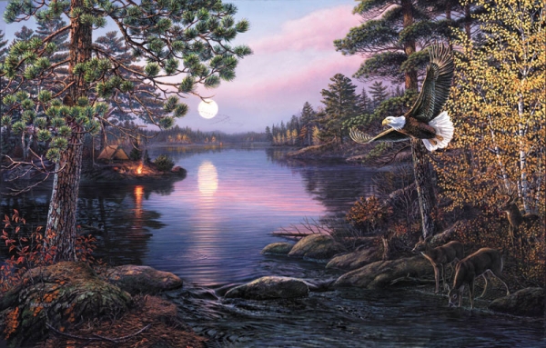 - (28484)1000ピース ジグソーパズル 米国輸入●SUN●黄昏の森と静かな湖畔、テントと焚き火、翼を広げて飛ぶハクトウワシ James Meger