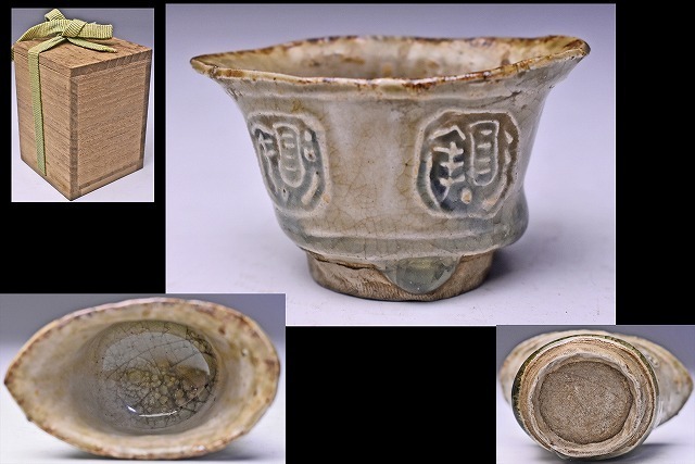 > 中国古玩 か 古萬古焼 か ★ 灰釉 楕円 片口 陽刻文 ぐい呑 ★ 木箱 ★ 手捻り 付け高台 ★ 酒器 ★ 詳細は不明なれど味わいのある逸品 ★