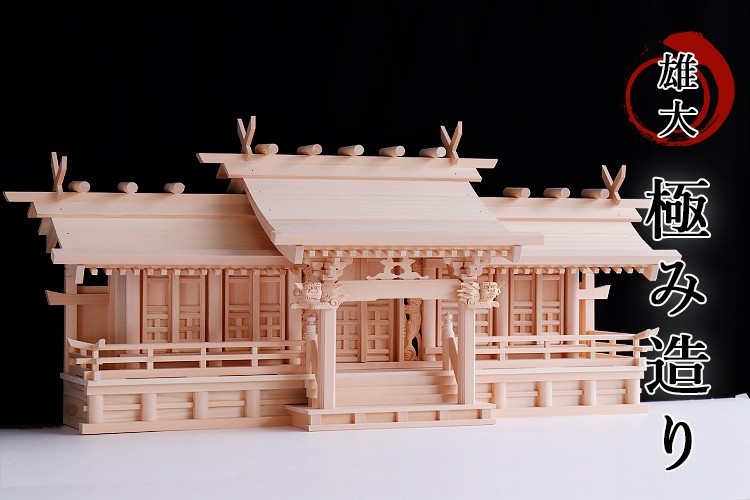 - 平安五社 中 ■ 雄大、極み造り ■ 荘厳大社シリーズの 神棚 ■ 特大 八幡屋根の 五社 双龍の彫刻門・低床唐戸 最高級 木曽桧 大型 社殿