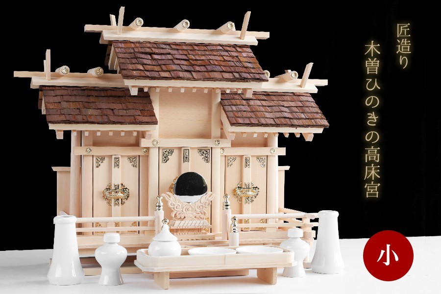 - 匠造り ■ 木曽ひのき ■ 圧巻 檜皮葺(ひわだぶき) 屋根 ■ 高床式 屋根違い 三社 小型 ■ 神棚セット 神具付き ■ 最高級 神棚